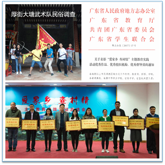 12月下旬,由省地方志办、省教育厅、团省委、省学联联合主办的“爱家乡查村情”主题教育实践活动总结会在广州举行。省地方志办主任、党组书记陈华康、副主任刘卫,省教育厅、团省委、省学联有关人员、获奖代表近200人参会。我校提交了近百余组各类作品参赛,在表彰中获得优秀组织奖,其中刘永安、李秀平等老师等获优秀指导老师,杨洲等一批同学作品获单项奖。