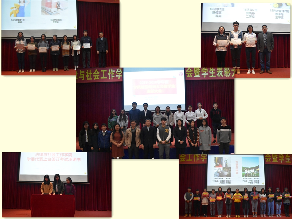 12月26日晚,法律与社会工作学院于莞城校区学术报告厅举行了2017-2018学年度学风建设动员会暨学生表彰会。学院党总支书记潘荣新、副院长夏能礼以及师生代表等。 会议强调了加强学风建设的必要性和重要性,分析了学院学风建设中存在的问题,提出改进措施,特别强调了期末考风考纪问题,要求同学们在大学期间认真学习、严格要求自己、学好本领。会上,各专业学委代表还签订了考试承诺书。 随后举行表彰会,为本学期学院涌现出的一批先进个人和集体进行表彰。