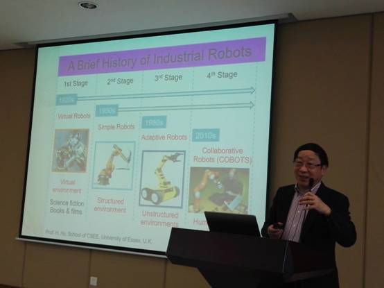 1月4日,应我校计算机与网络安全学院及海外引进杰出人才李耘教授的邀请,英国埃塞克斯大学(University of Essex)机器人研究的学科带头人胡豁生教授,在我校学术会议中心作了题为《先进工业机器人的应用与展望 - 工业4.0》的学术报告。