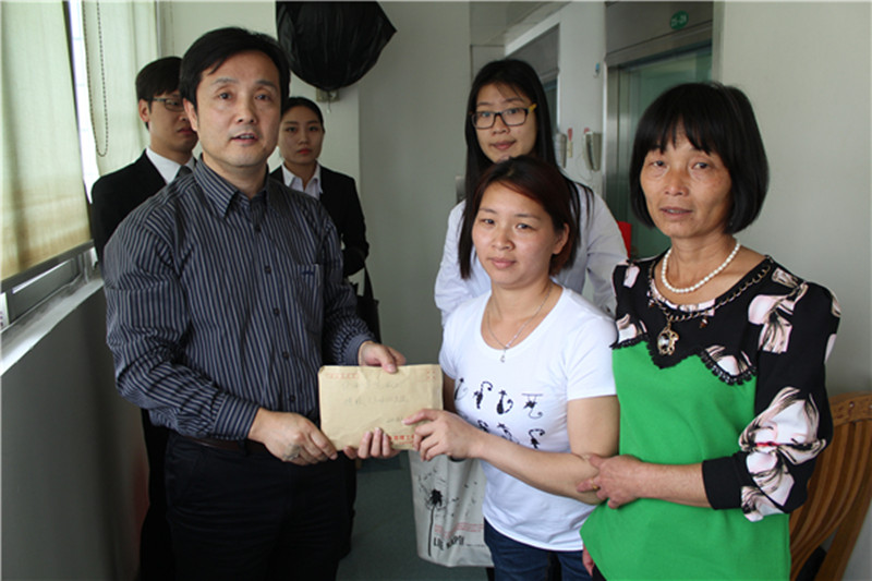 君光一行人在晓慧家属的陪同下来到了晓慧的病房前,由家属口中得知晓慧由于白细胞的减少,抵抗力降低,只能入住被隔离开来的无菌仓,外界只能和她打电话进行沟通。他们在电话里安慰晓慧配合医生,安心治病,同时鼓励晓慧及其家属要勇于与病魔抗争,争取早日康复,回归校园。随后,君光一行给家属送上了善款,其中包括化环学院教工捐款13400元、化环学院校友会基金会善款10000元、东莞理工学院善款2000元、化环学院校友会理事会及其好友捐赠的23700元和银丰逸居酒店善款10000元。银丰逸居酒店的代表还带来了银丰逸居酒店特意为晓慧制作的心意卡,卡上面有酒店全体员工的签名和早日康复的祝福语。当晓慧母亲接过善款和心意卡,已感动得泣不成声,用家乡话一次一次地对学校及社会各界善心人士的关爱表达万二分的感谢。