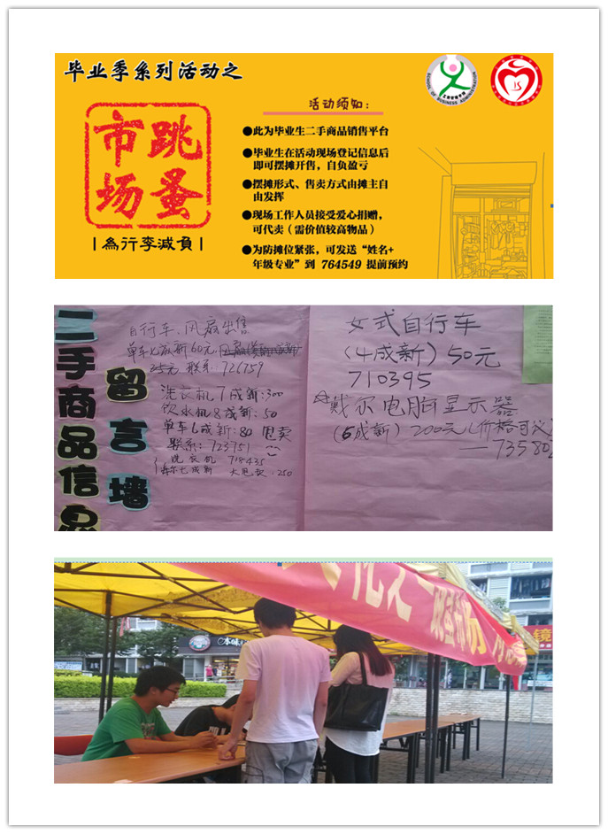 “跳蚤市场”为需要销售二手货品的毕业生提供场地和人力、物力支持,让毕业生有条件将不带走的物品以二手商品的形式售卖出去。同时,服务站还设置了爱心摊位,毕业生可以把书籍资料、旧衣服等爱心物资捐给生活四年的学生社区。活动期间,不少毕业生们通过这一平台卖出了风扇、单车等二手商品。服务站还募集了一批爱心物资,将在整理后把捐赠的物品用于社区公益。毕业“跳蚤市场”的举办为莞工学生社区毕业季文化氛围的营造增色不少。