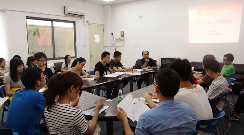 座谈会上,工商管理学院党总支书记唐元松为师生们介绍了习近平总书记的系列重要讲话,重点剖析了社会主义核心价值观这一课题。在解读了为什么需要社会主义核心价值观、社会主义核心价值观的内涵是什么后,唐元松结合习近平总书记五四在北大的讲话精神,就当代大学生如何学习和践行社会主义核心价值观谈了个人体会,引发在场师生的深刻思考。