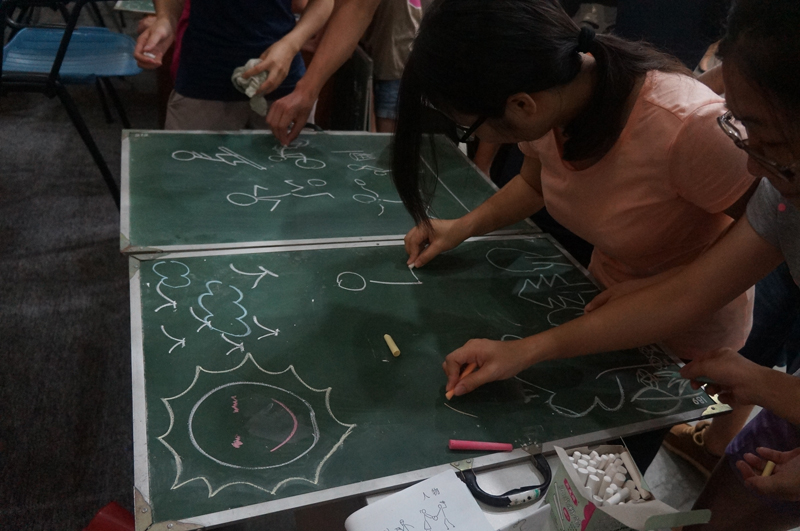 本次拓展活动分为两类,第一类为专业类,包括粉笔字、简笔画、绕口令、编故事、情景模拟(课本剧);第二类为拓展类,包括游戏“你争我赶”、“画画接龙”。活动以同学们的随机分组正式宣告开始。在小组孵化展示中,各小组的同学绞尽脑汁、出谋献策,共同设计出有创意的队名、口号、队歌、队徽等。随后,多种多样的拓展活动在同学们积极热情的参与下一一展开,为了增强竞争性、体现公平性和提高活动效率,还安排了评委对各组进行评分。粉笔字、简笔画等,通过在小黑板上完成,最后向大家展示;而绕口令、编故事、情景模拟等则通过口述和表演等形式开展,其中难度最大和最精彩的莫过于情景模拟,同学们利用一些简单的道具和充满趣味的表演,将故事的情景展现在大家面前,喝彩声、掌声、欢笑声阵阵响起,也将活动气氛推向高潮。在游戏环节,同学们更是玩得不亦乐乎,激烈的竞争让人紧张,蹩脚的画技使人爆笑。
