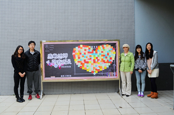 11月28日,建筑工程系的同学也过起了西方的感恩节。同学们将自己想对老师说的话和对老师悉心培育的感激之情写在一张小卡纸上,并把小卡纸拼成心形贴在该系的宣传展板上。此外,同学们还到老师的办公室开展拜访活动,感谢老师们对学生的悉心栽培。