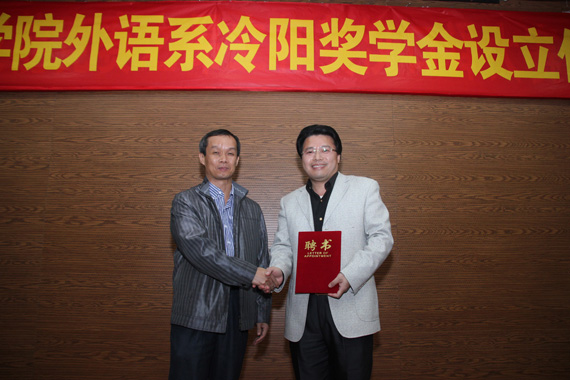 东莞市拓福实业有限公司董事长、东莞市九江商会会长冷阳在我校外语系设立“冷阳”奖学金,并于 12月13日举行签约仪式。冷阳和我校外语系党总支书记罗碧波签定了合约。
