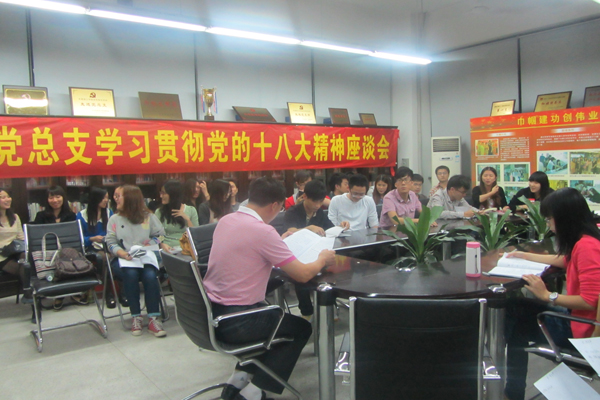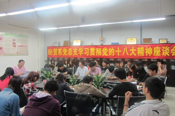 近日,经贸系党总支组织党员在经贸系会议室召开学习贯彻党的十八大精神座谈会。座谈会由经贸系党总支副书记杨万江主持。