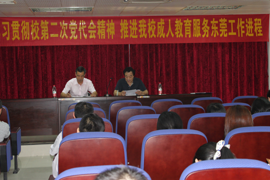 学习会上,成教学院党总支书记程克江传达学校第二次党代会精神,对东莞市委书记、市人大常委会主任徐建华的讲话精神和校党委书记成洪波所作的工作报告《凝心聚力创新发展 努力建设特色鲜明的高水平应用型地方大学》做了认真分析,并结合我校成人教育工作,要求全体教职工把党代会精神落实到实际工作中去。