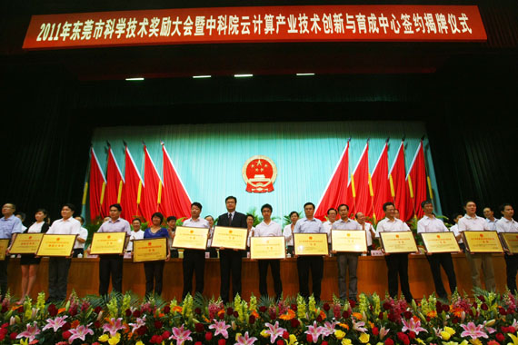2011年东莞市科学技术奖励大会暨中科院云计算产业技术创新与育成中心签约揭牌仪式于10月21日在东莞市会议大厦举行。78项科技成果、两位技术领军人物以及4家创新企业,分别荣获2011年东莞市科学技术奖。