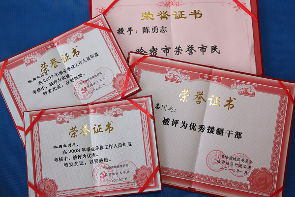 在这次工作中,陈勇志取得了优异的成绩,被中共哈密地区委员会、哈密地区行政公署评为“优秀援疆干部”,连续两度在哈密地区事业单位工作人员年度考核中被评为“优秀”;还被礼聘为“哈密市荣誉市民”。(文/叶海青  陈运银)