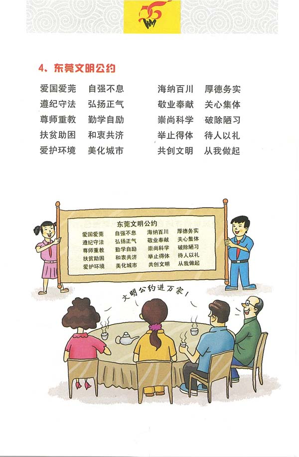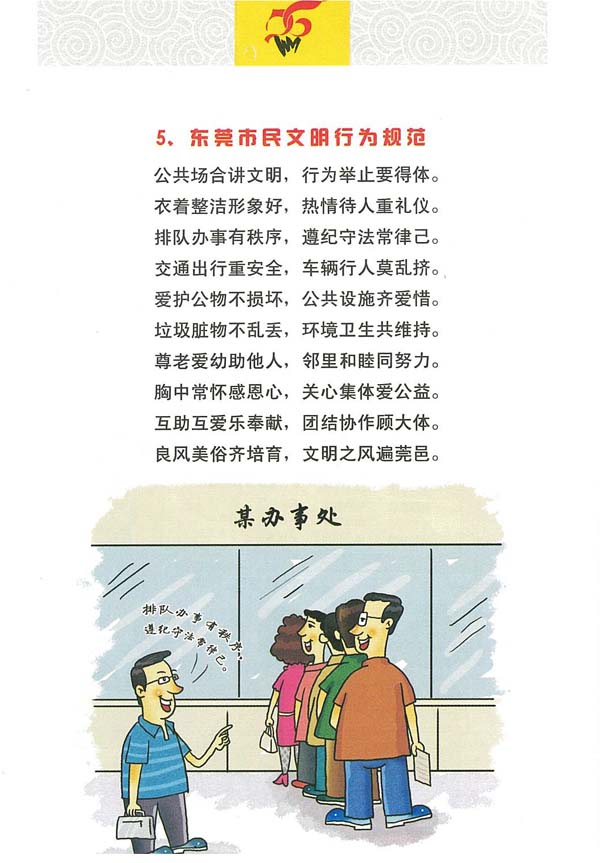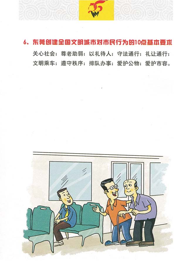 遵章守法,躬行实践。把一切文明要求落实到具体行动上。我们要严格遵守国家的有关法律法规和政府的相关政令,自觉遵守《东莞市文明公约》、《东莞市民文明行为规范》和《创建全国文明城市对市民行为的10点基本要求》等的具体要求。坚决摒弃有损城市形象、不利群众生活的各种不文明行为,讲文明语言,行文明礼仪,做文明事情,养文明习惯,树文明新风,培育良好的道德风尚。