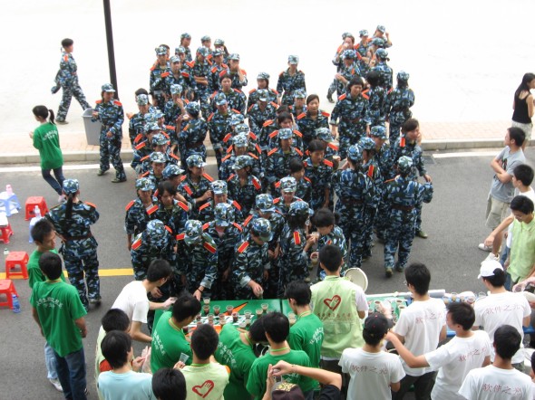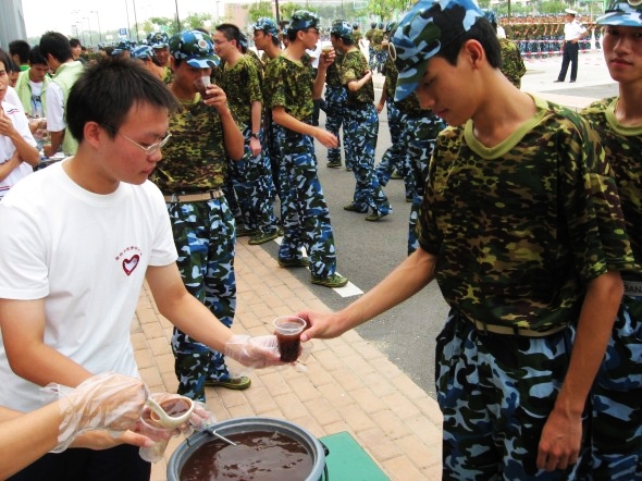 为弘扬“奉献、友爱、互助、进步”的精神, 9月16日下午3:00,软件学院志愿者服务站与化学生物工程系志愿服务站携手合作,在军训现场组织送糖水并慰问新生的活动。 第一节军训课结束后,07级的新生们井然有序地排着队伍领取师兄师姐们送来的糖水,这小小的一杯糖水盛满了老师、还有师兄师姐对07级新生们的关怀.喝过糖水,教官们、新生们又投入到紧张、严肃的军训当中了。