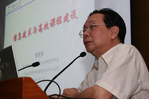 李克东教授的报告题目是《信息技术与高校课程建设》,报告共分四个部分,包括:提高教学质量是当前高校的重要任务、课程建设在教育教学改革中的核心地位、信息技术与精品课程建设和总结;报告重点探讨了在现代教育技术突飞猛进的当下,如何利用好这一技术,丰富课程建设,提高课程教育质量,同时结合学校教育教学的实际,更好地把这一技术运用到精品课程建设当中去。