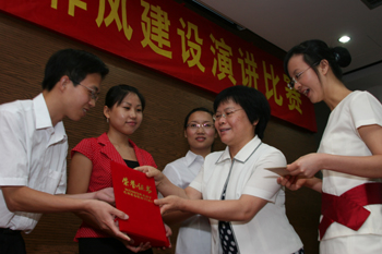5月29日,机关作风建设演讲比赛在学术交流中心报告厅举行。8名选手代表机关8个党支部参加比赛,他们分别以各自身边感人的事例,声情并茂地演绎对机关作风建设的理解。 学院党委副书记王江水、黄碧莲和副院长戴炳源出席观看了比赛,并为获奖的选手颁奖。 王密思(机关三支部)获得一等奖,二等奖获得者分别是李利平(机关一支部)、谈娟(机关六支部)、郭智强(机关四支部),获得三等奖的选手是黄睿(机关二支部),优秀奖为卫红权(机关七支部)、郭词飞(机关八支部)、邓思波(机关五支部)所获得。